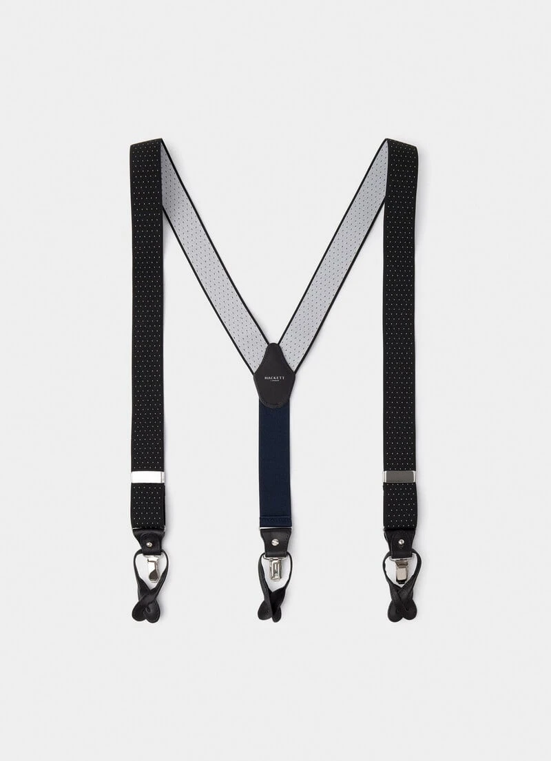 These elegant and innovative, stretchy combi braces with a polka dot print are handmade in England. The clever, adjustable design offers clip-on and button fastening, and contrasting leather details.